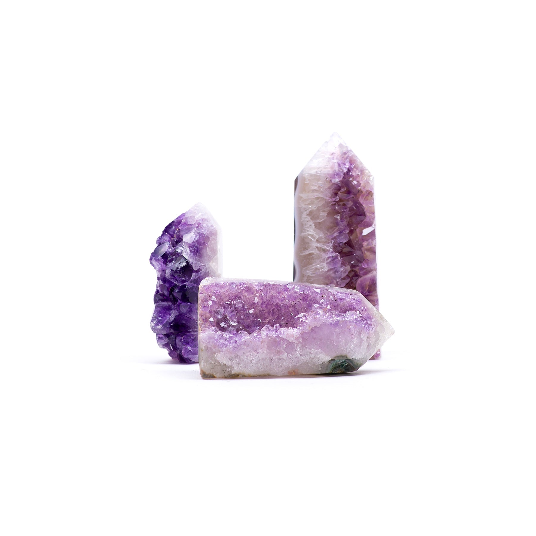 These points feature small amethyst crystal clusters in a geode- like formation, which are cut into a generator or point shape, leaving the glittering, concave crystal structure to showcase the crystal's beauty. A very cool addition to your altar, home decor, or workspace.